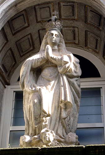 La hornacina se enmarca por dos pilastras cajeadas de orden corintio, que sujetan un friso corrido de ornamentación vegetal. Estas pilastras están flanqueadas a su vez por las típicas volutas barrocas y por decoración de sartas de frutas. A los lados de este segundo nivel se encuentran, sobre pedestales, los escudos de los arzobispos Juan de Sanclemente, el fundador, y Antonio de Monroy, su reedificador. Corona esta portada un frontón curvo partido que da cobijo a una cartela ovalada con la siguiente inscripción: “EL YLLMO SE DN FRAY ANTONIO DE MOROY ARBPOS Y SE DE ISTA CVD MDO REEDIFICAR A SUS EXPENSAS ESTE CLEGIO PA RECOGIMENTO Y EDUCAO D DZELLAS HUERFANAS D ESTE REINO AÑO 1715”.